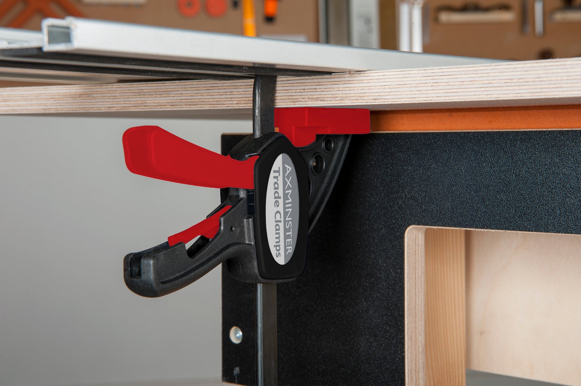 Owners of multi function workbenches can use the clamp as a hold-down simply by inserting the spigot into a dog hole. The single-handed operation leaves one hand free to steady the workpiece. The moving jaw has a resilient protective pad to prevent damage to delicate surfaces.