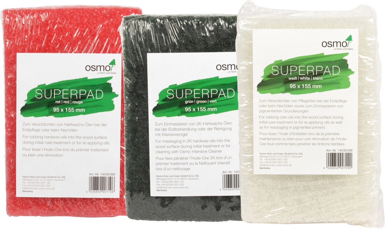 - The Green Superpad is a coarse pad suitable for use with Osmo Intensive Cleaner or when massaging in 2K hardwax oils.