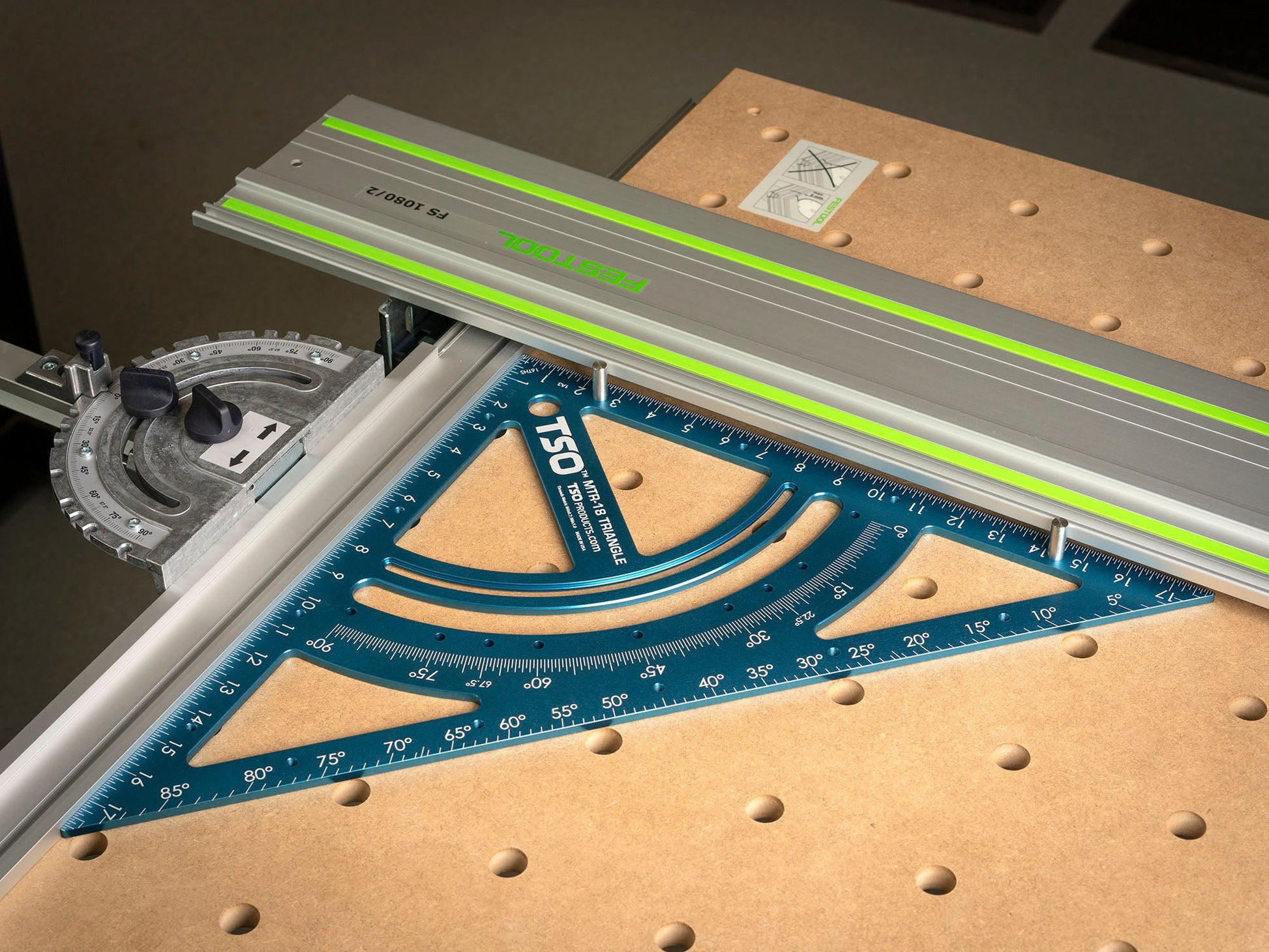 A first-of-its-kind tool, the MTR-18 combines the accuracy of a CNC-machined precision triangle with a range of included accessories enabling countless linear and angle measurement, squaring and clamping/fixturing applications. Designed to take advantage of popular 20mm hole patterned worktops, the MTR-18 can be secured through the worktop with the included DoubleGroove Bench Dogs and M8 SpeedKnobs. Dial in a precise angle with the MTR-18's large protractor scale with parallax-free pointer, and then lock it in place. With a long edge of more than 635mm (25") and body thickness of over 6mm (1/4”), the MTR-18 can even act as a removable fence for the Festool MFT/3 or any 20x96mm patterned work surface. When used in conjunction with an MFT/3 style 20mm worktop, the MTR-18 sets the standard for accuracy and speed of set-up.