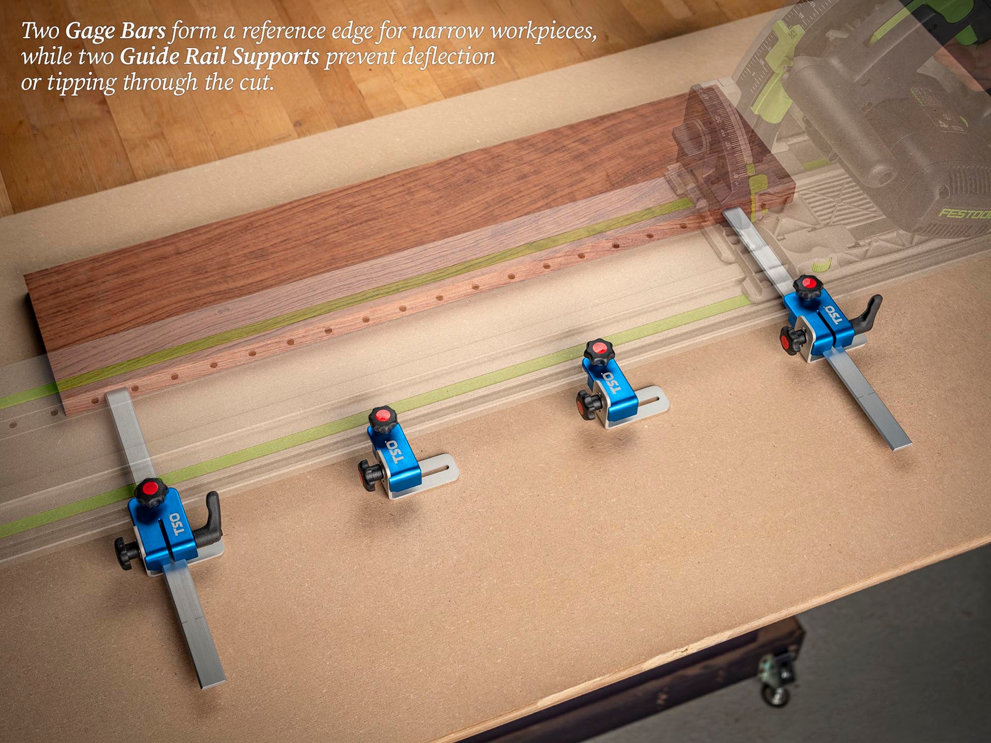 Track saws aren’t designed for narrow cuts—and that becomes obvious fast. With no support under the guide rail, it tends to sag or tilt under the weight of the saw. And when your workpiece is narrower than the guide rail itself, there’s no good way to register your cut. Narrow Stock Pro solves both problems at once, with two Guide Rail Supports to prevent tipping or deflection, while two precision Gage Bars extend under the guide rail from the left to create a reliable fence that makes narrow cuts not just possible—but repeatable and dead accurate.