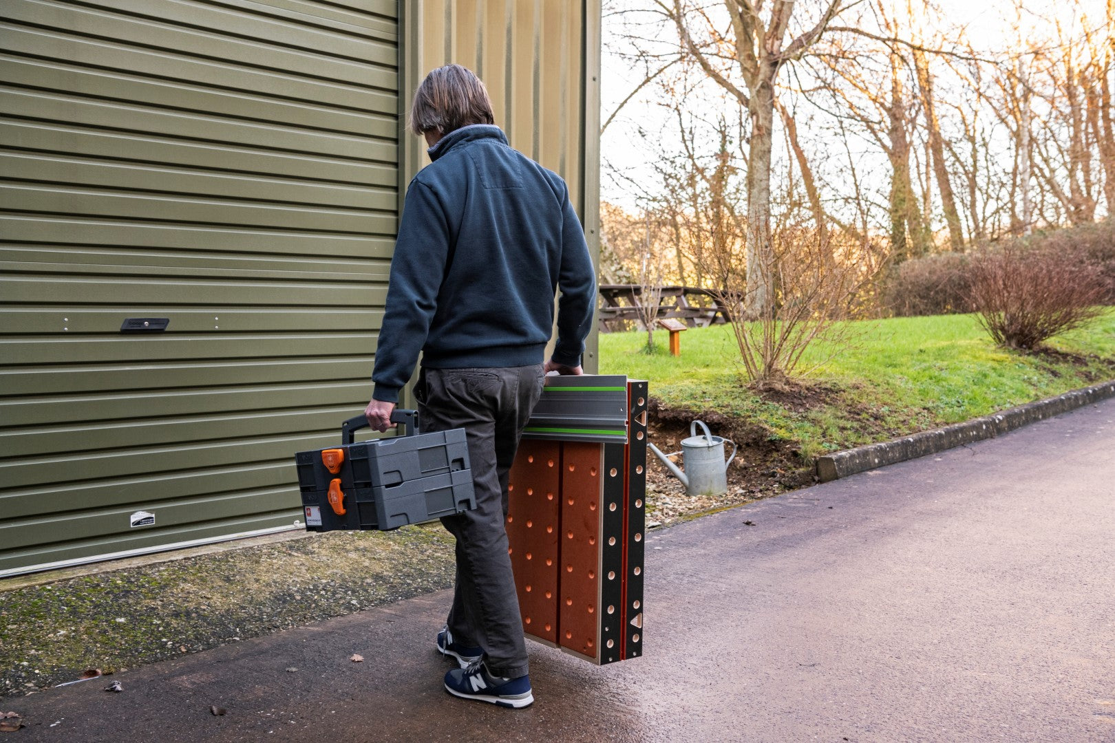 The top is 18mm thick Valchromat, the same material as used for the full size UJK Multifunction benches. It offers a generous work area of 750mm x 430mm. A grid of 20mm dog holes at 96mm centres allow you to make use of bench dogs, UJK Cam Clamps and other UJK accessories. In addition, a length of T-Track provides potential for various UJK hold downs and doubles as a 'going bar' when sawing.