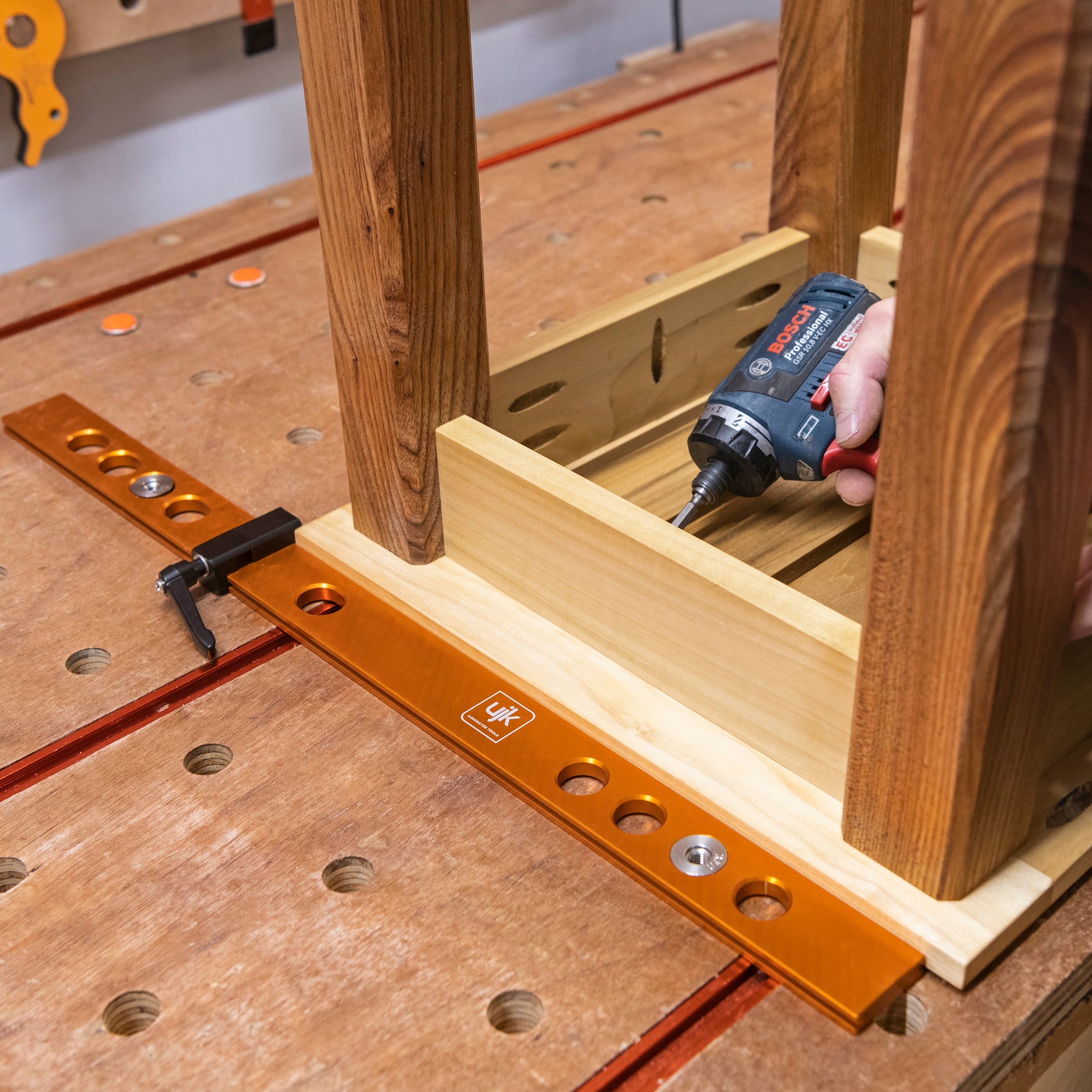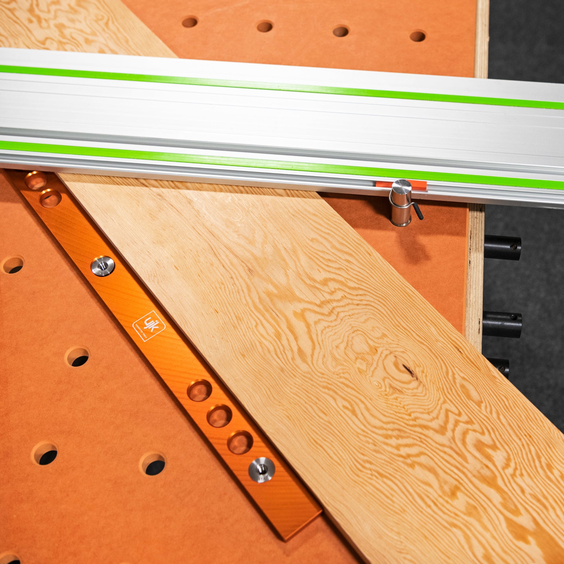 The fence functions as its title suggests, giving you a 600mm long straight edge making it easy to locate a workpiece against when cutting on the multifunction bench. With the fence in place there is no need to reposition bench dogs when cutting different lengths. The stop allows you to make accurate repeat cuts, long or short. With the stop in place and moving the fence one hole along, shifts the stock by 32mm, for marking, drilling etc. Two fences positioned at 90° are a great aid when assembling cabinet frames or drawers etc. The fence can be used over the top of the workpiece and has an additional hole for setting at 45°. The more you use this piece of equipment the more uses you will find for it.